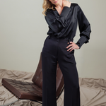 Sculpted from fluid black silk satin, the Eclipse Trousers redefine modern elegance. The high-waisted silhouette elongates the figure, while the subtle flared leg moves with quiet fluidity. A study in balance — minimal in form, yet rich in presence — these trousers embody the essence of understated luxury.