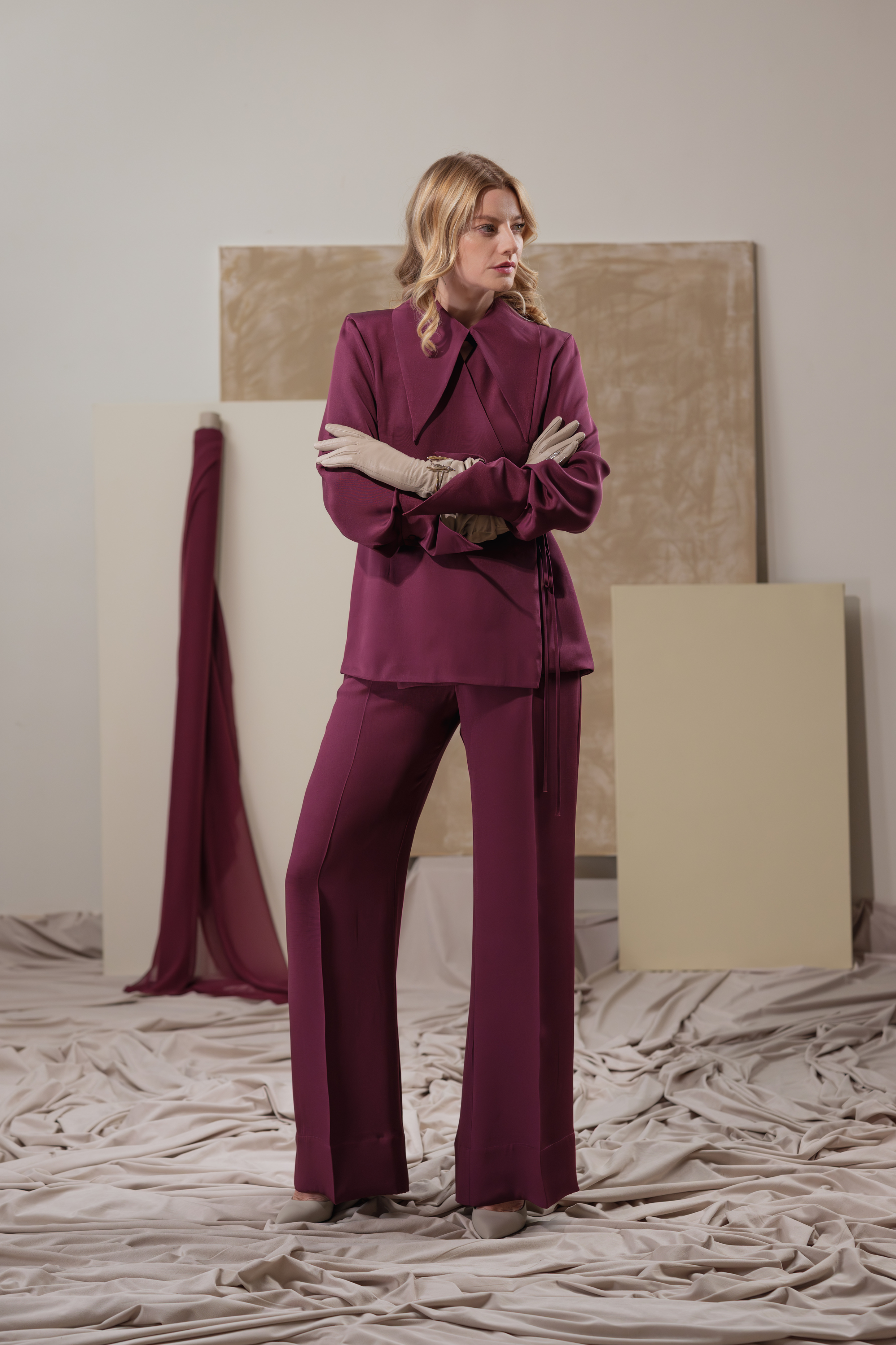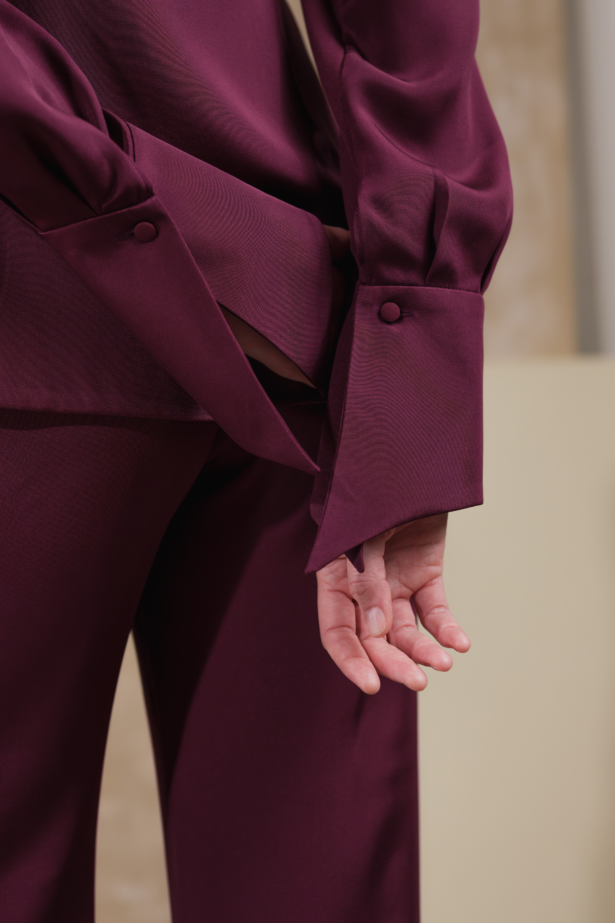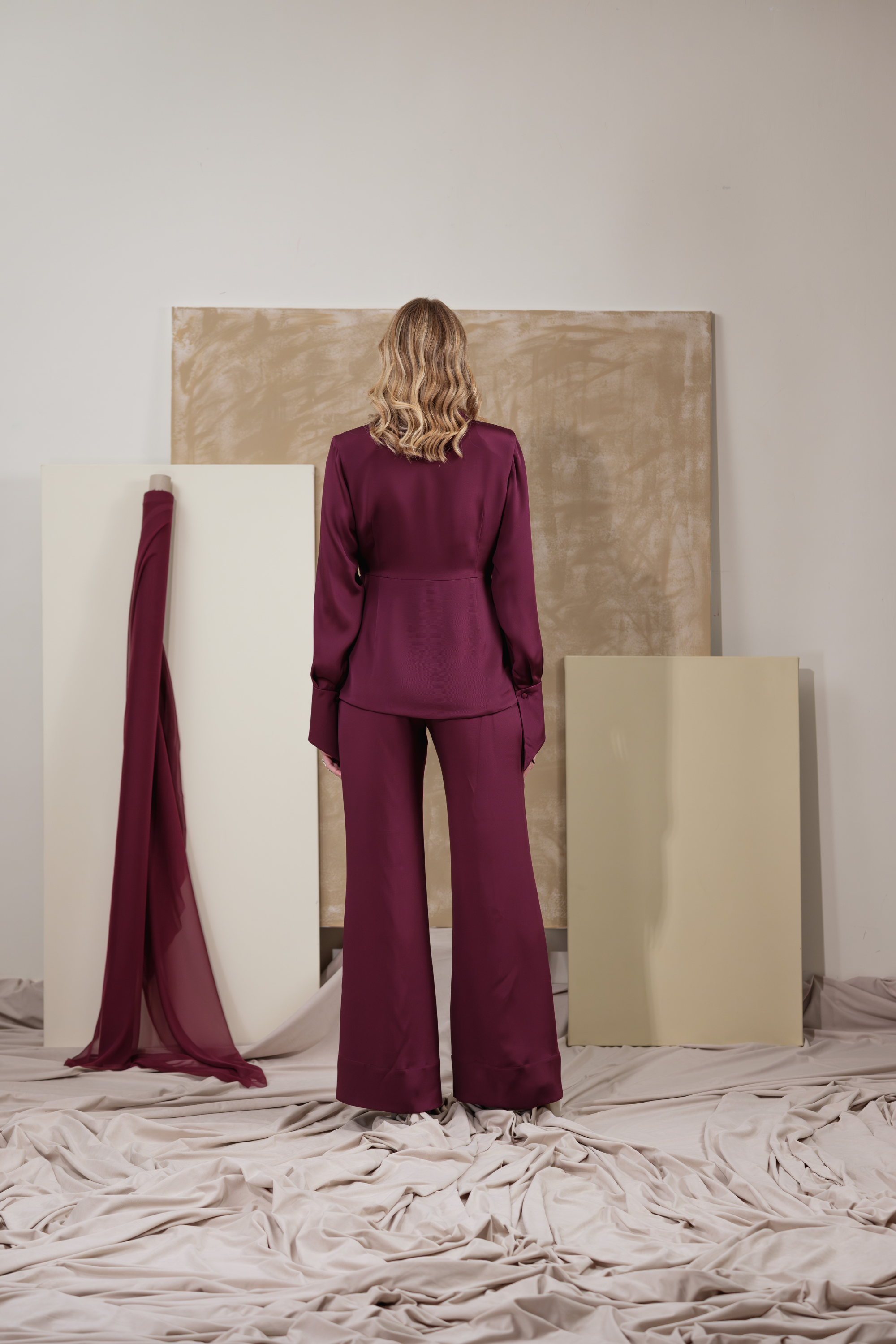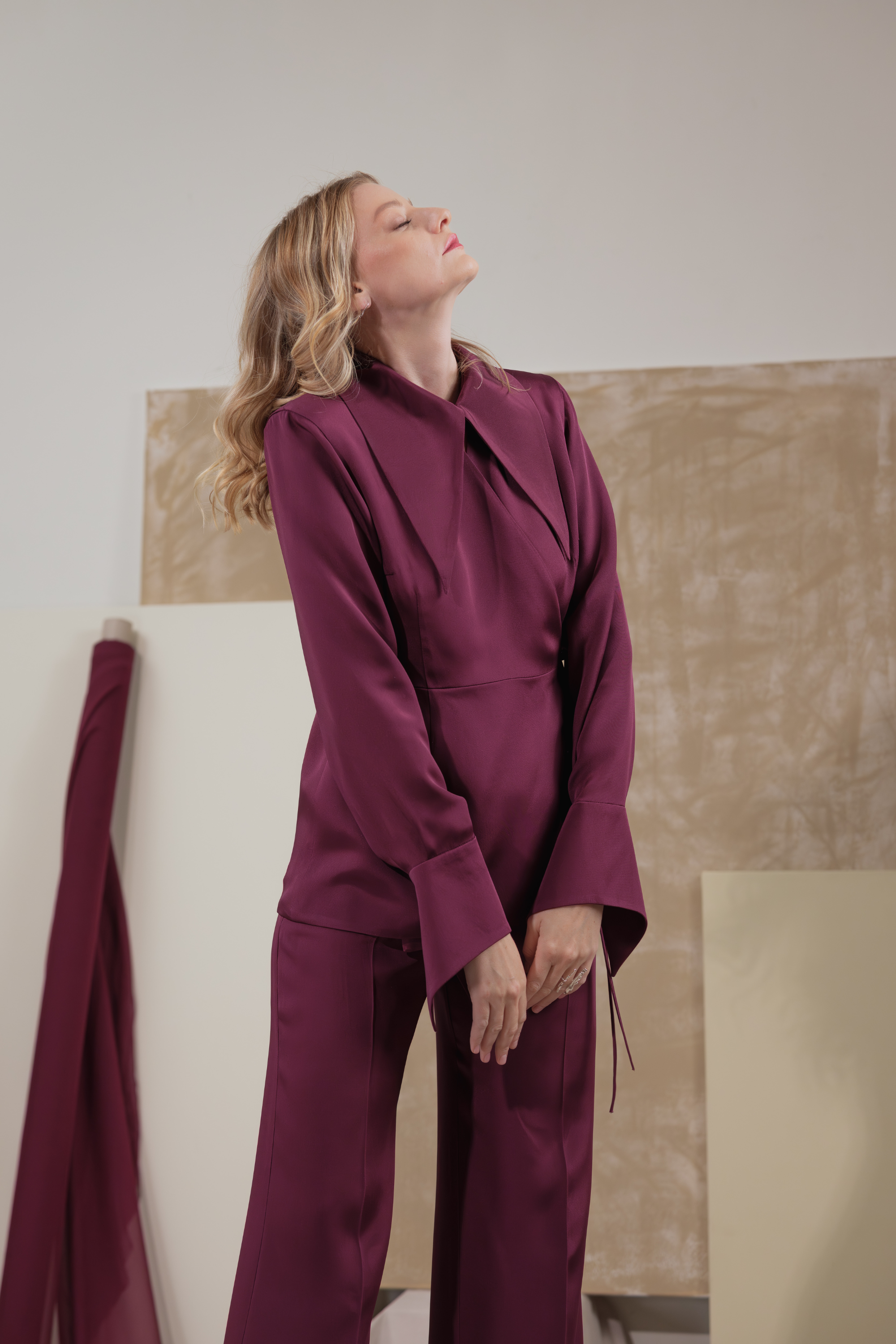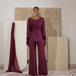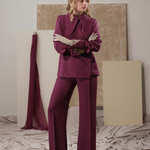 Tailored from lustrous burgundy silk satin, the Mulberry Haze Blazer redefines feminine tailoring with a fluid, shirt-inspired silhouette. The elongated collar and wrap-around tie gently frame the waist, creating a sculpted yet effortless line. Finished with silk-covered buttons and wide, structured cuffs, it embodies the art of quiet sophistication — soft, refined, and timelessly elegant.